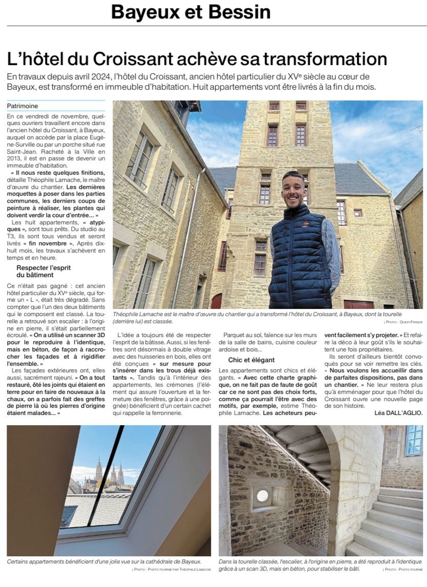 En travaux depuis avril 2024, l’hôtel du Croissant, ancien hôtel particulier du XVe siècle au cœur de Bayeux, est transformé en immeuble d’habitation. Huit appartements vont être livrés à la fin du mois.